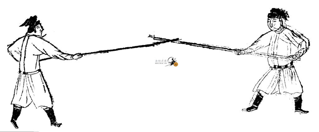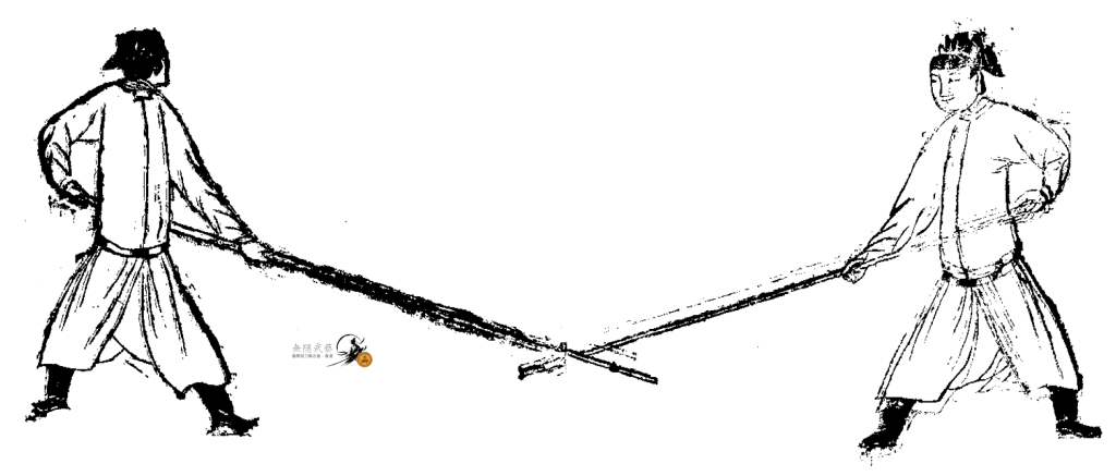 中平破中平,其勢至難破,平識搌挫圈槍顛梢弄纂,方可以中平破中平,不然即用後圖考中另破法。他棍撘我棍二尺餘,即發搌挫,他棍必開我,補槍中殺彼。能用者,我一掁他即滑過門,上槍殺來,我轉跟槍挫法,他槍自開中平勢,近來識用搌挫,破者少,此一法學者細心詳究。