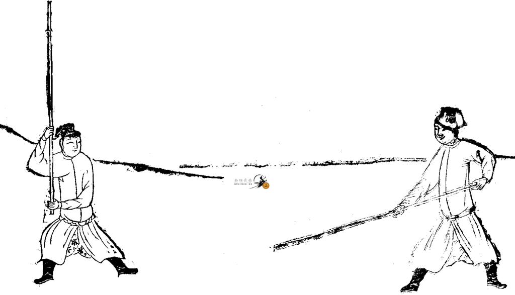 此開門勢,我槍頭不討敵人,各開三四尺,火熖槍破按膝,我棍橫打他棍,腰硬跟上似封槍手法,披打虎口上槍,他能救,我即漏過門上騎龍步跟殺。